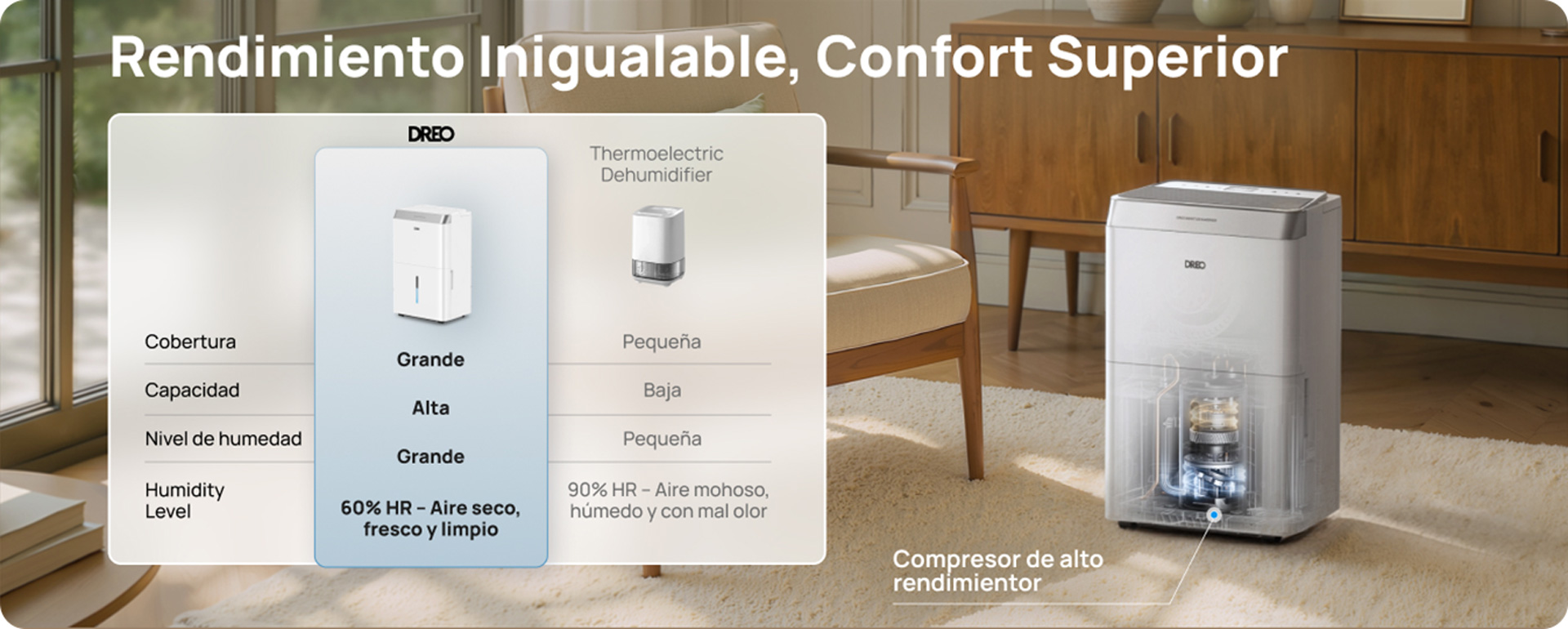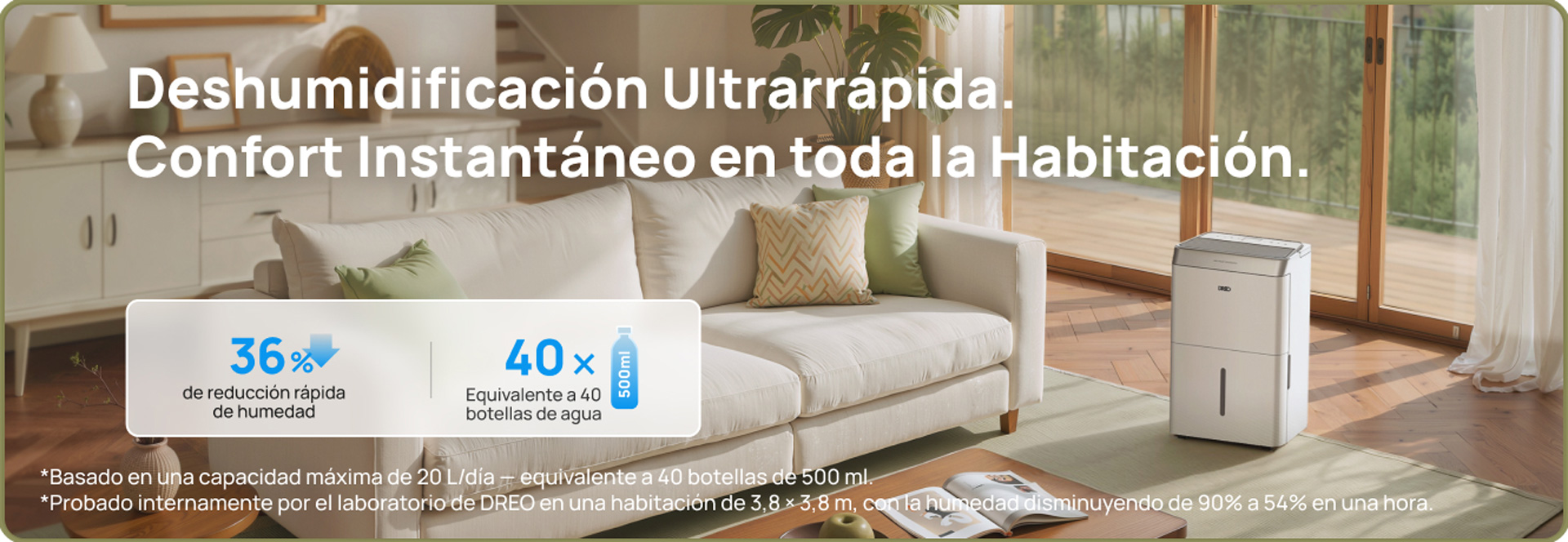 El equipo ofrece una capacidad de hasta 20 litros al día. En condiciones de 30 °C y 80 % de humedad relativa, puede reducir aproximadamente un 36 % de la humedad en una hora, contribuyendo a mejorar el confort y la salubridad del ambiente interior. En pruebas de laboratorio de DREO, en una habitación de 3,8 × 3,8 × 3 m, la humedad descendió del 90 % al 54 % en 60 minutos.