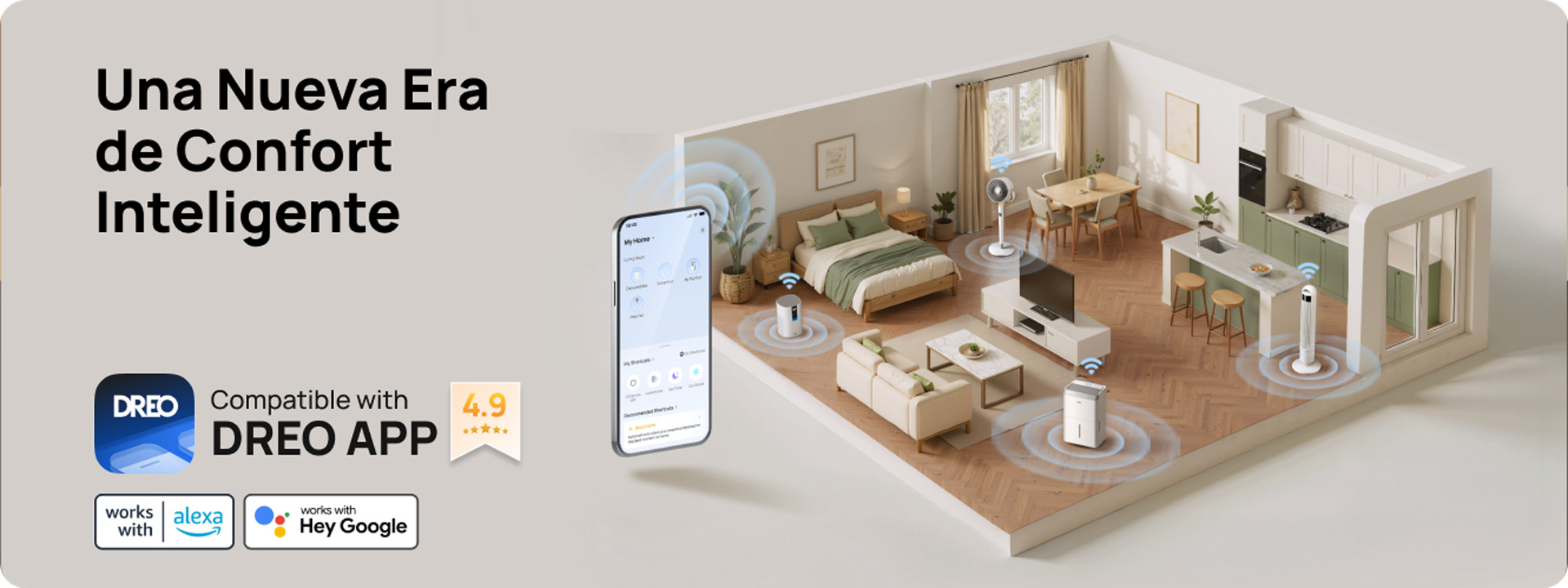 Permite el control remoto de la humedad a través de la aplicación DREO y mediante asistentes de voz compatibles como Alexa y Google Home.