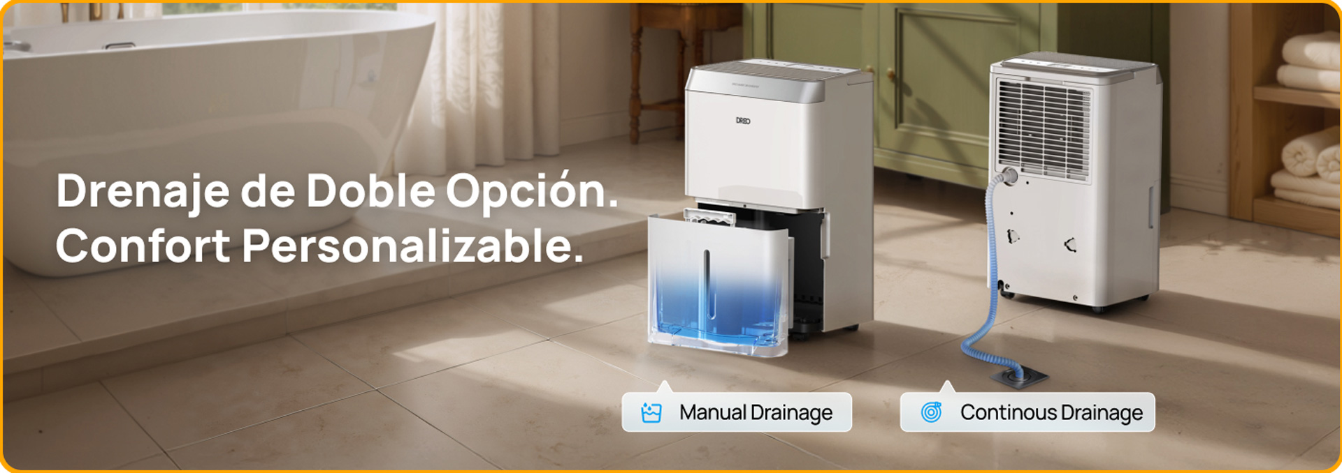Permite dos métodos de evacuación del agua: vaciado manual del depósito o drenaje continuo mediante manguera. El equipo avisa cuando el depósito está lleno y detiene el funcionamiento por seguridad.