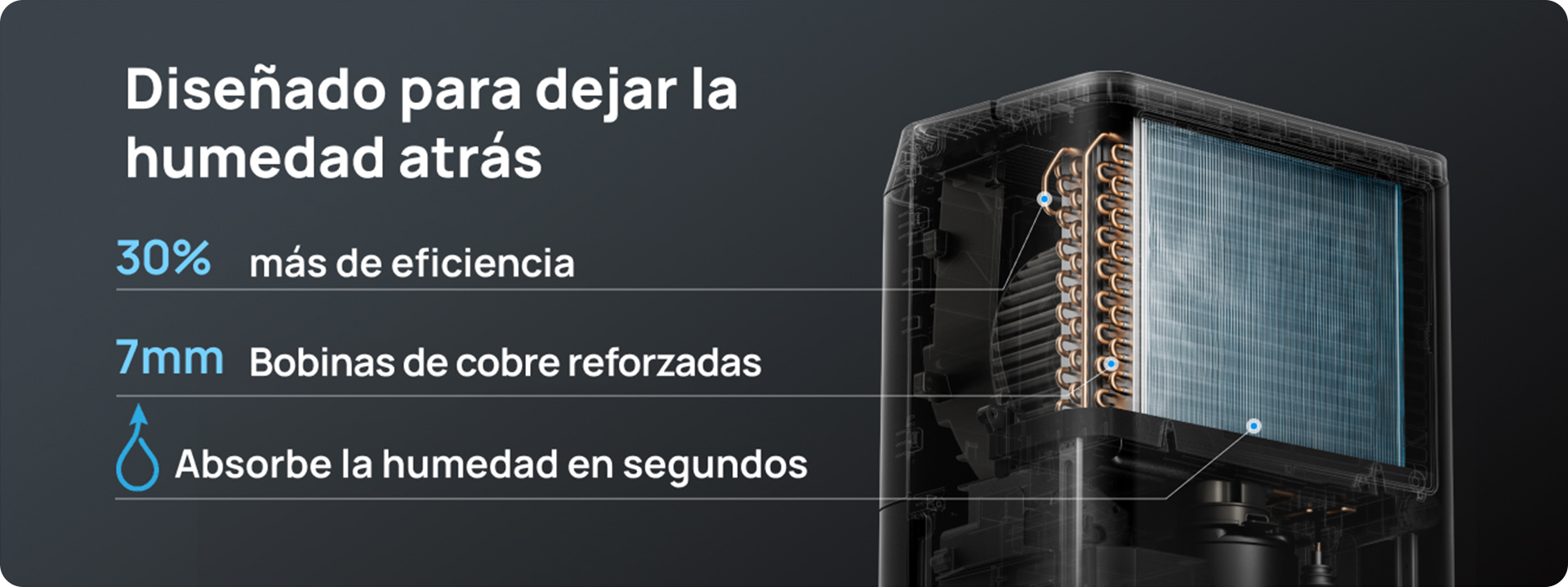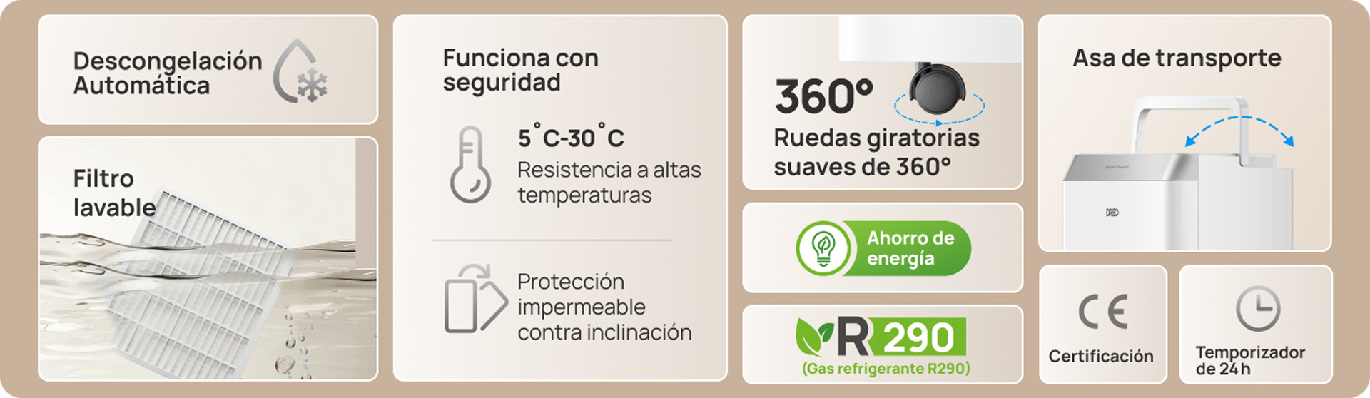 • Capacidad de deshumidificación: hasta 20 L/24 h (a 30 °C y 80 % HR)