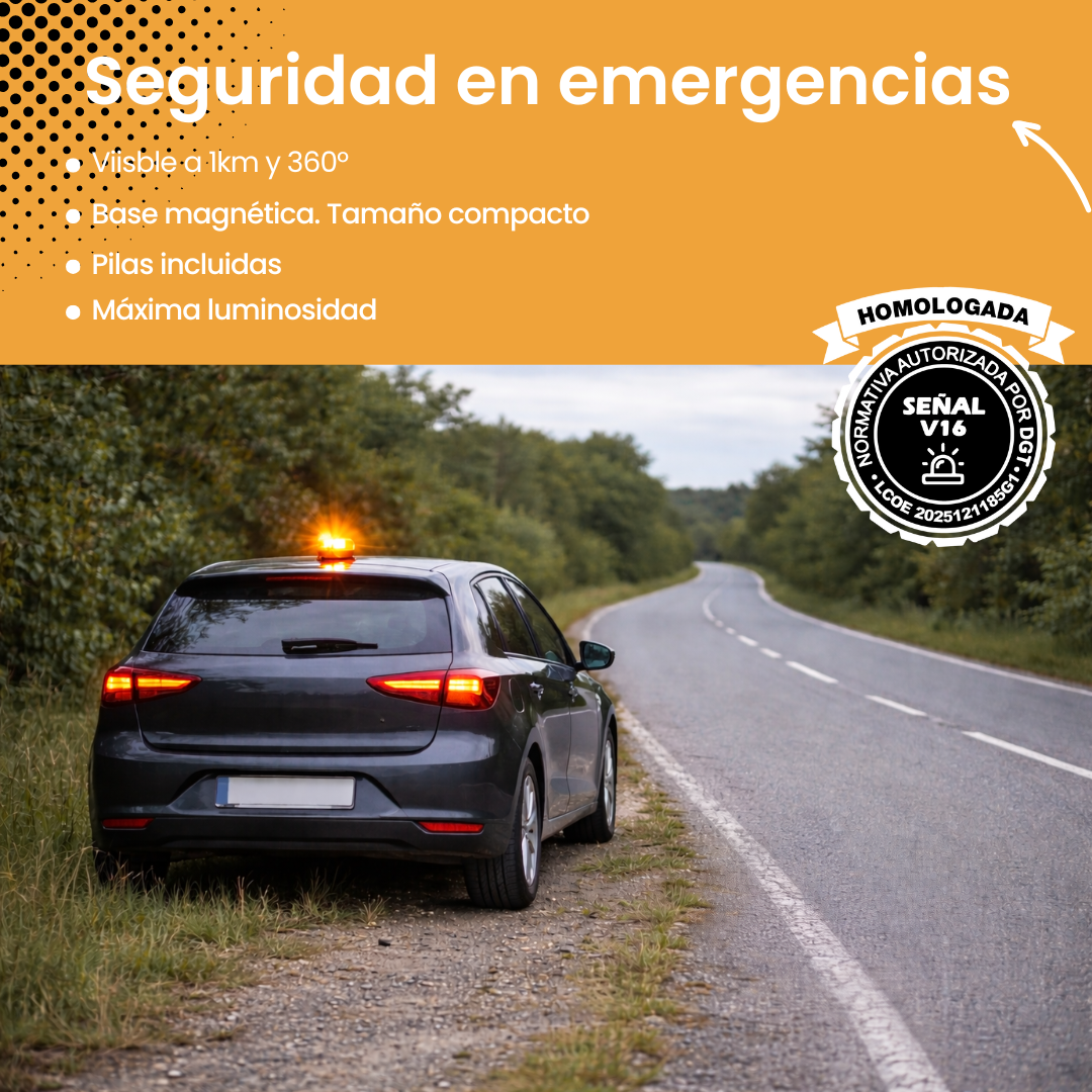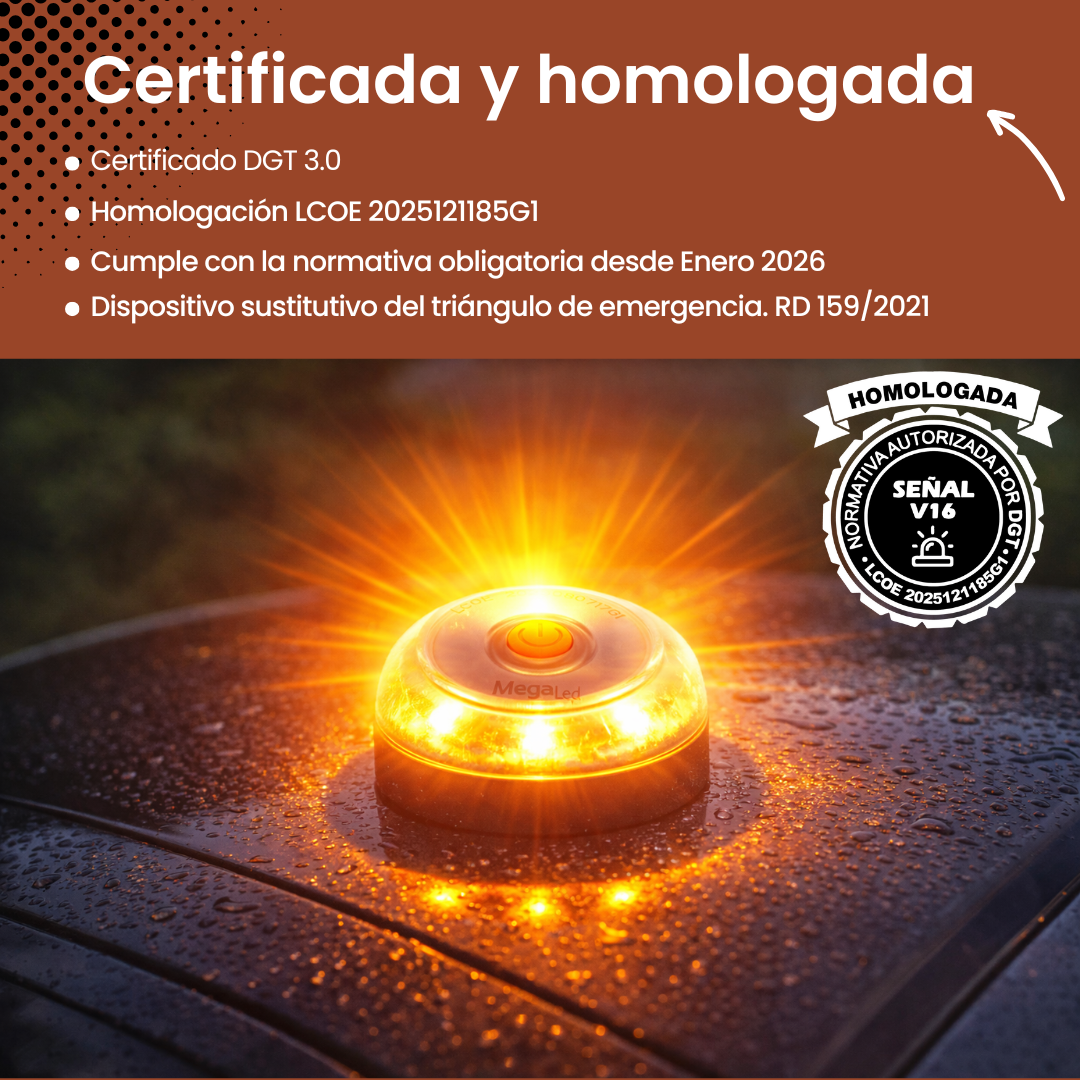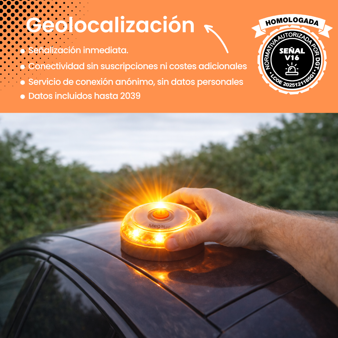 La luz de emergencia V16 de MEGALED está homologada por la DGT y lista para el cambio obligatorio en 2026. Cuenta con geolocalización conectada a través de Vodafone, sin cuotas hasta 2039. Visible a más de 1 km, con base magnética para instalar sin salir del coche. Funciona con pilas incluidas. Compacta, resistente y válida para coches y motos, garantiza seguridad inmediata en cualquier situación vial.