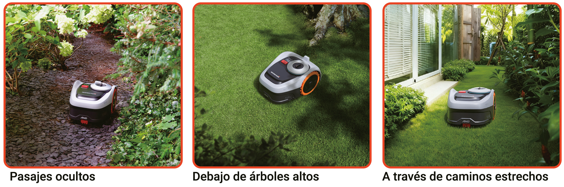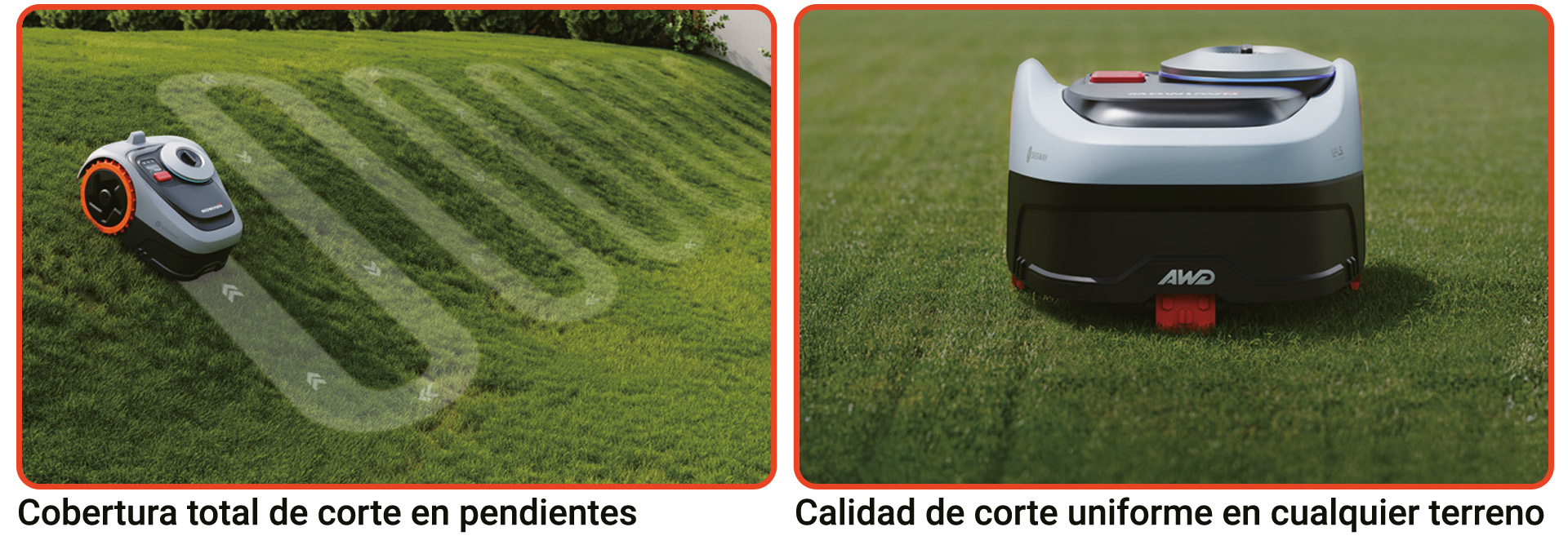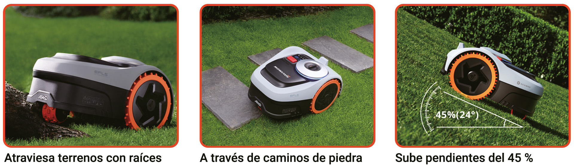 Con un sistema de tracción integral y ruedas todoterreno de 24,8 cm, el cortacésped puede enfrentarse a pendientes de hasta el 45 % (24°) y se desplaza fácilmente por terrenos cubiertos de raíces, sube escalones verticales de hasta 4 cm y se desplaza por caminos irregulares de piedra. Puede desplazarse por cualquier terreno sin quedarse atascado, manteniendo siempre el control.