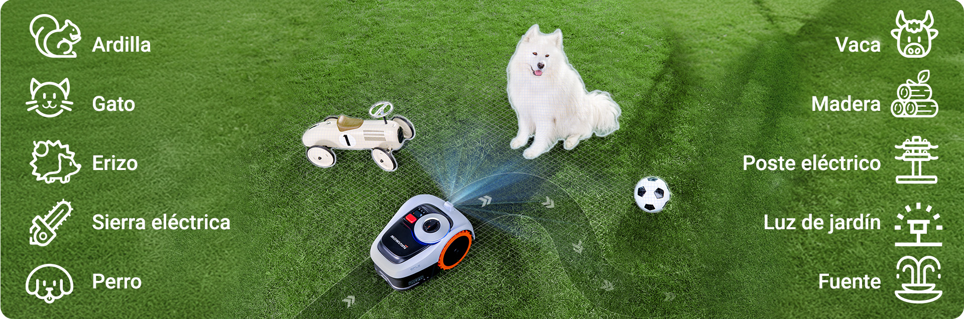 El cortacésped utiliza algoritmos avanzados de visión e IA para detectar con precisión mascotas, herramientas e incluso pequeños obstáculos de tan solo 1 cm. Decide de manera inteligente si seguir cortando o evitar un obstáculo, recalculando la ruta en 0,1 segundos y manteniendo una distancia segura de al menos 1 metro.